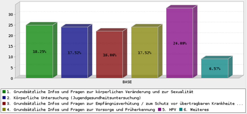 Bisher bieten nur 22 % der befragten Urologinnen und Urologen eine „Jungensprechstunde“ an. Als häufigste Nennung der aufgegriffenen Themen und Untersuchungen wird die HPV-Impfung genannt mit 24 % der Nennungen, gefolgt von grundsätzlichen Infos und Fragen zur Empfängnisverhütung / zum Schutz vor übertragbaren Krankheiten, körperlicher Untersuchung (Jugendgesundheitsuntersuchung) und grundsätzlichen Infos und Fragen zur Vorsorge und Früherkennung mit jeweils (gerundet) 18 % der Nennungen.
